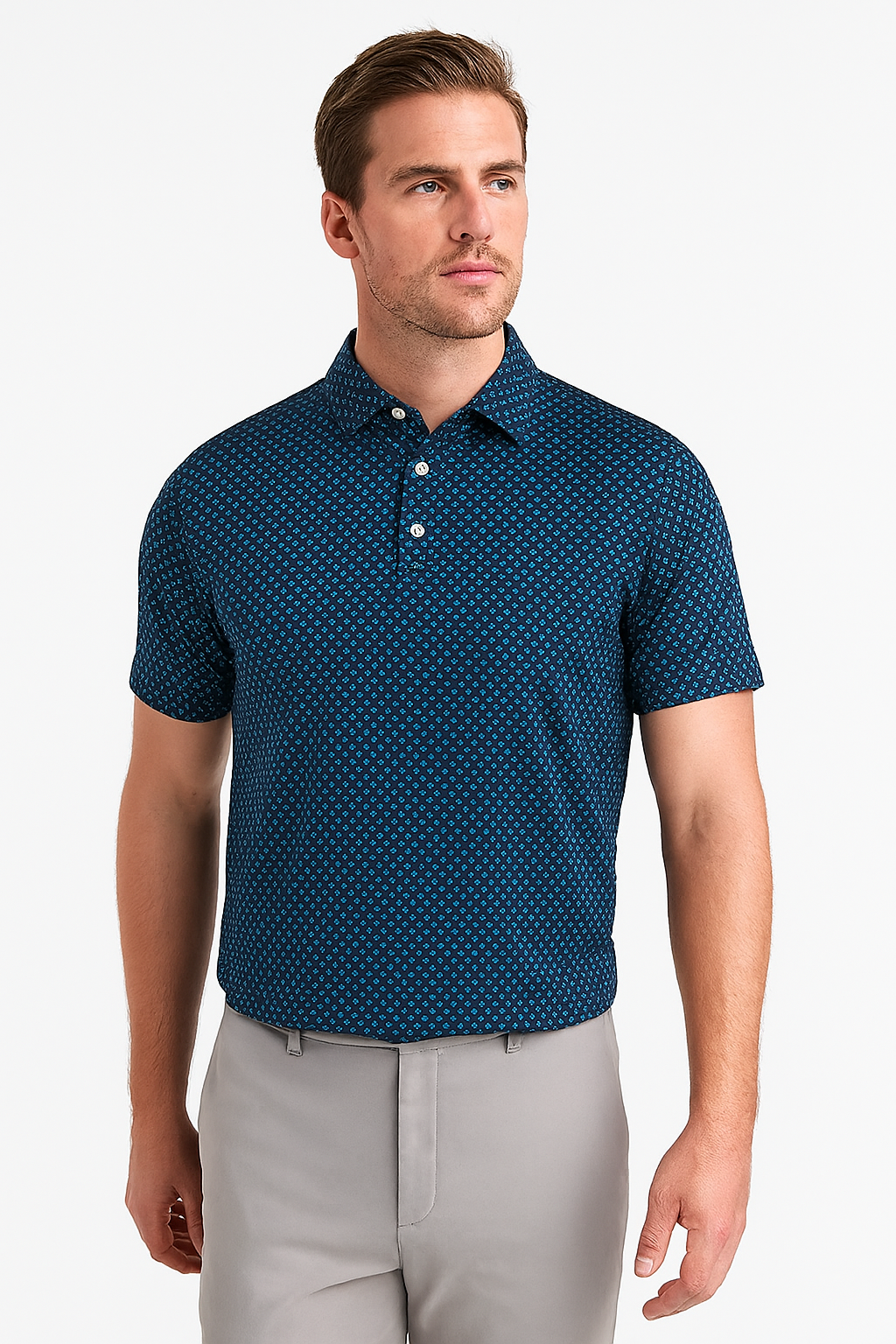 Designed for refined versatility, this navy geometric performance polo combines classic elegance with cutting-edge comfort. Crafted from lightweight, stretch-enhanced fabric, it delivers breathability and moisture control while its intricate pattern adds a touch of modern sophistication for both leisure and performance wear.