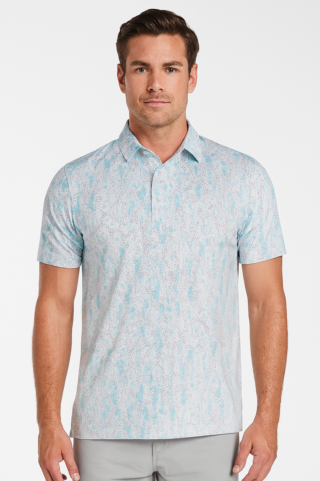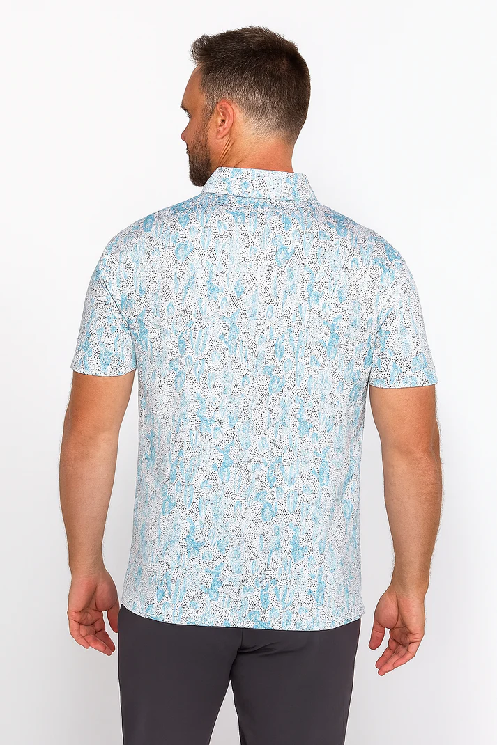 Crafted for elevated versatility, this mist blue abstract performance polo delivers a refined balance of comfort and contemporary style. Made from breathable, stretch-infused fabric with advanced moisture-wicking technology, it ensures a cool, dry feel even in warm conditions. The subtle watercolor-inspired pattern adds a soft artistic touch, making it ideal for both casual outings and polished looks.