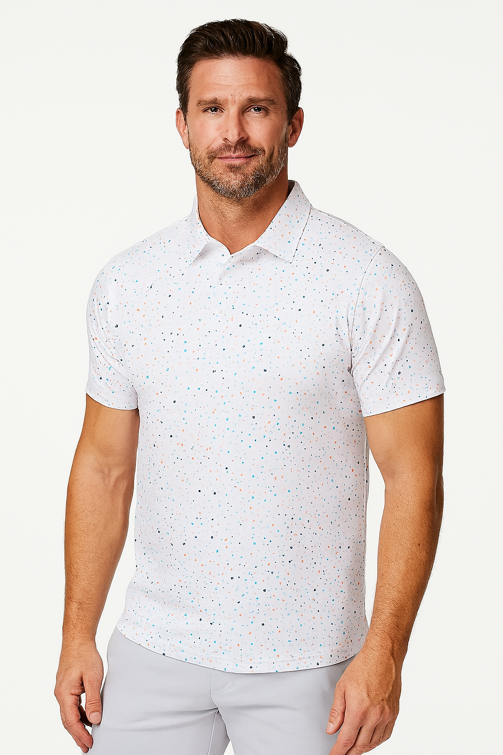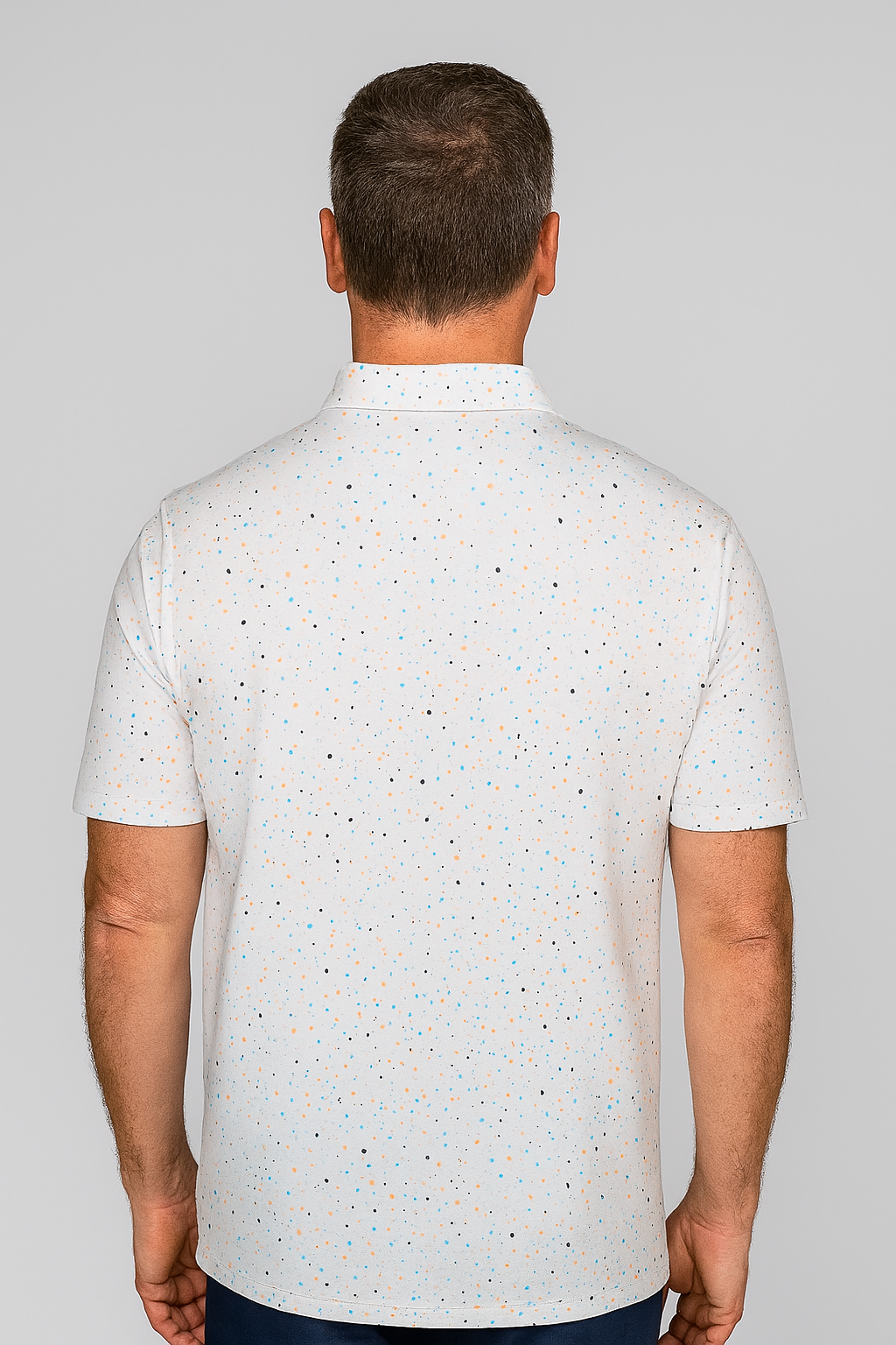Designed for refined versatility, this confetti-inspired performance polo brings playful sophistication to everyday style. Crafted from soft, lightweight stretch fabric with advanced moisture-wicking properties, it delivers exceptional comfort and breathability. The subtle multicolor dotted pattern adds a modern yet understated charm perfect for both casual and active settings.