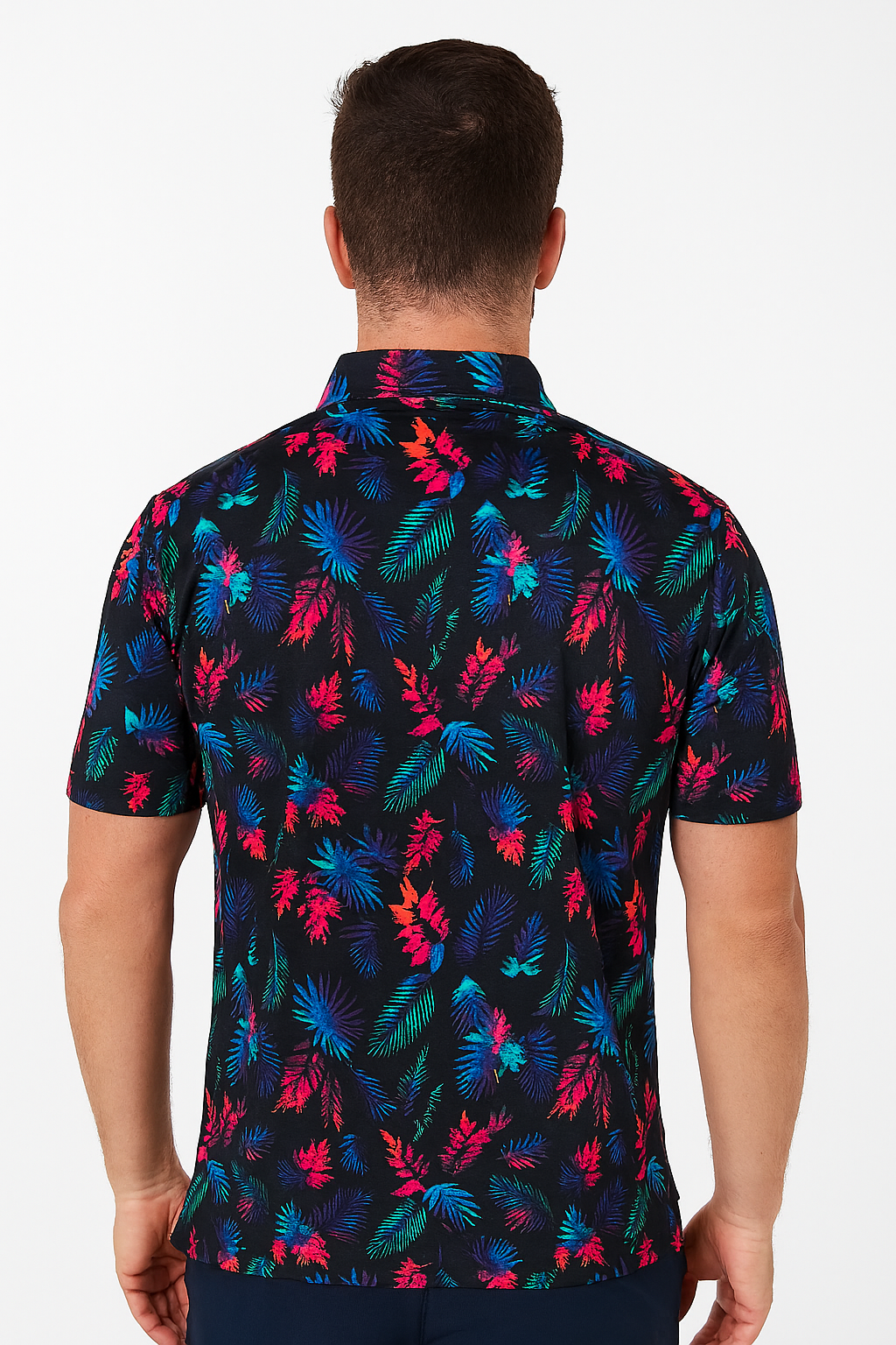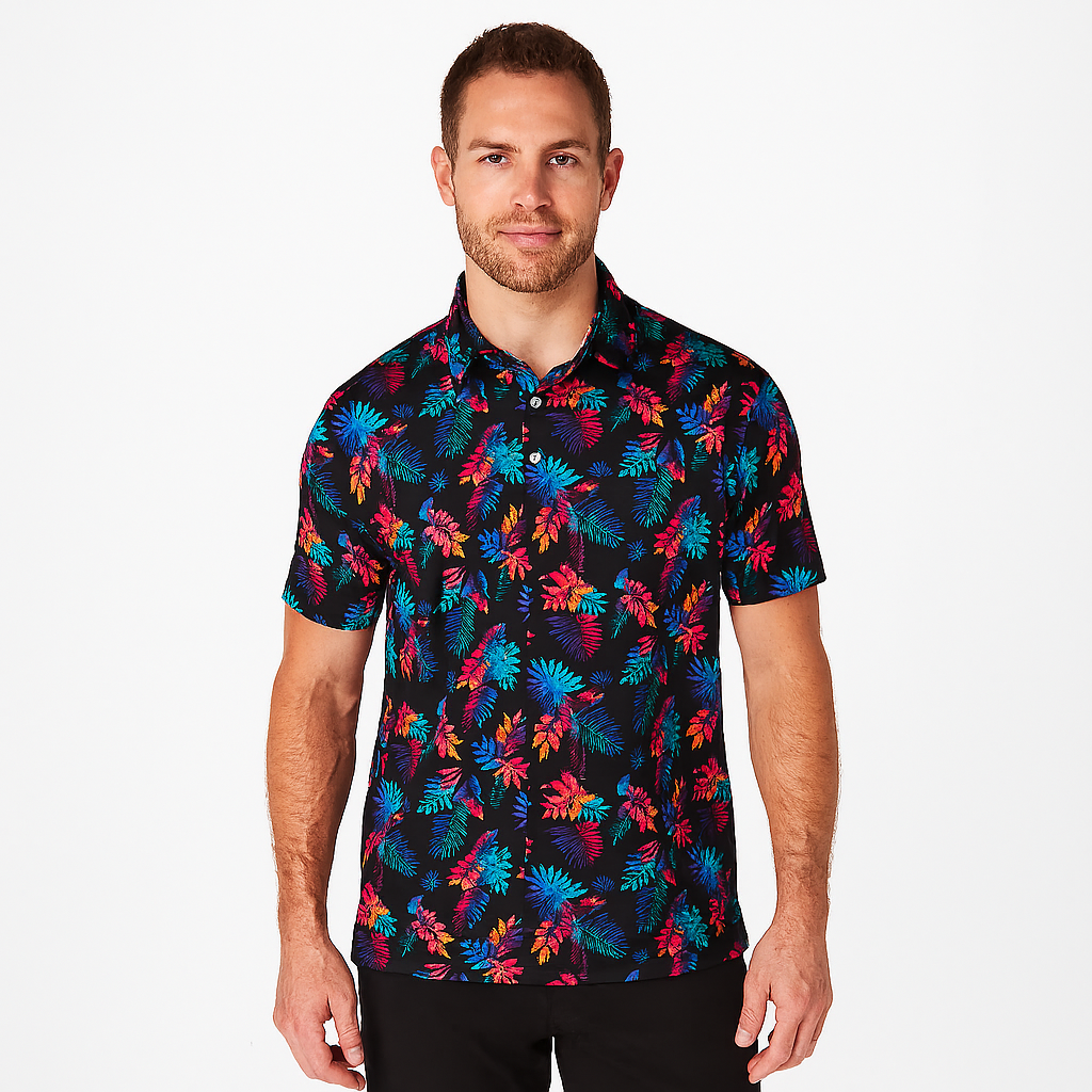 Vibrant and performance-ready, this tropical print polo captures the spirit of bold sophistication. Crafted from breathable, stretch-infused fabric with moisture-wicking technology, it offers exceptional comfort and style. The vivid leaf pattern against a sleek black base brings an energetic yet refined touch to your active wardrobe.