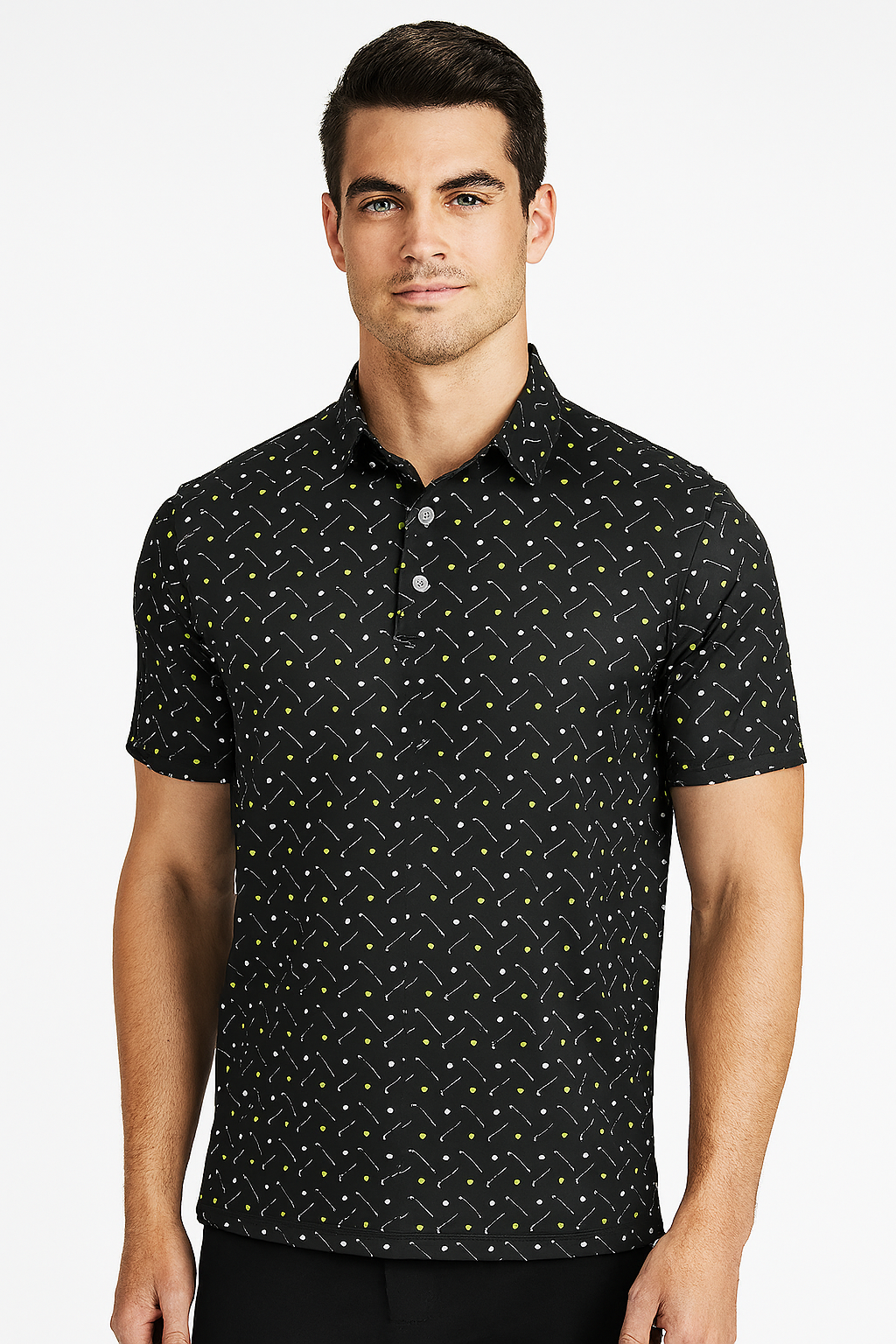 Crafted for dynamic sophistication, this black performance polo combines sleek design with athletic versatility. Made from ultra-light stretch fabric featuring advanced moisture-wicking technology, it keeps you cool and composed from the course to casual evenings. The playful golf club and ball print adds a subtle touch of personality while maintaining a polished modern look.
