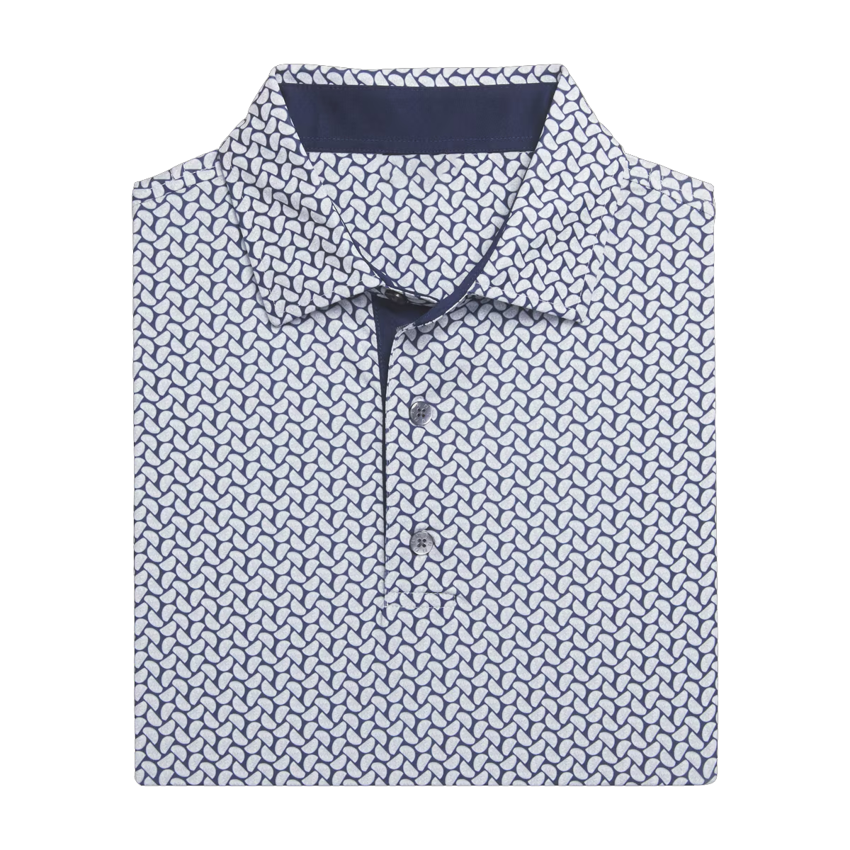 Crafted for elevated performance, this navy geometric print polo combines refined style with technical excellence. Designed from a premium stretch fabric, it offers lightweight comfort and superior breathability for active days. The intricate interlocking pattern adds visual depth while maintaining a clean, modern look that transitions seamlessly from the course to casual settings.