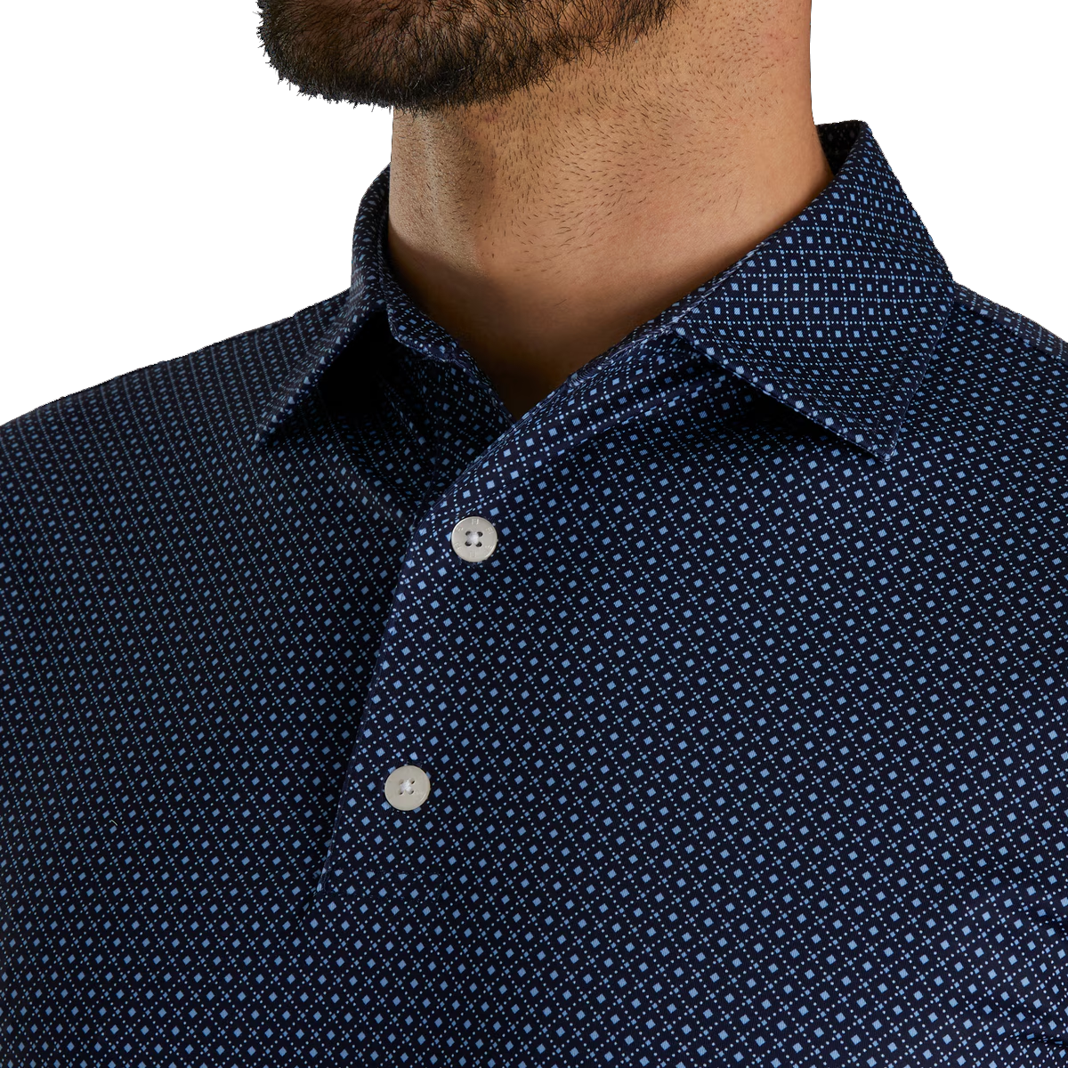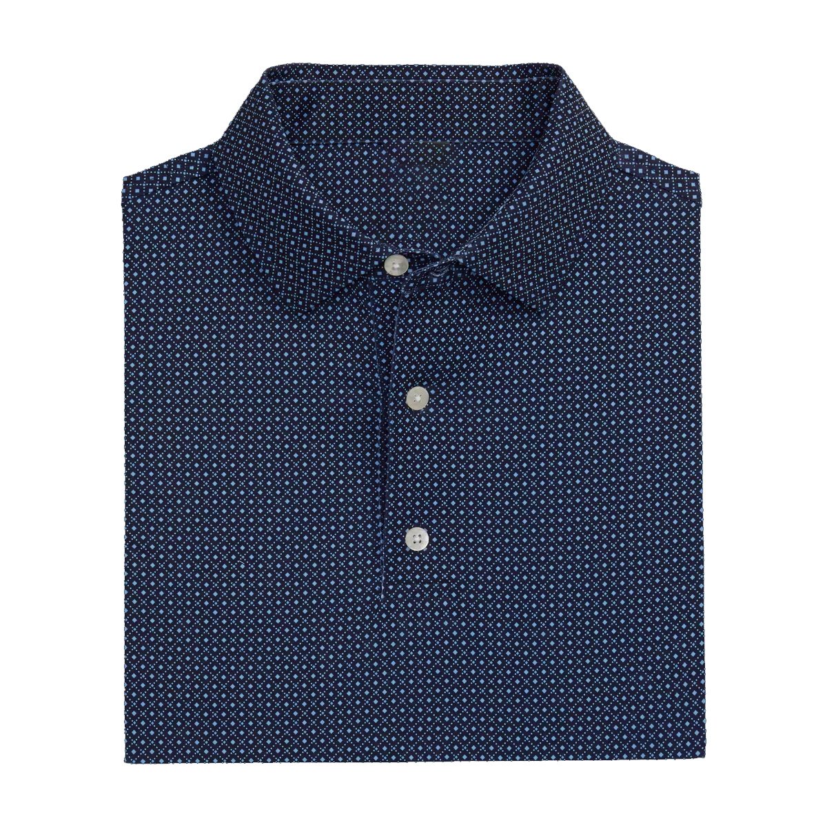 Crafted for timeless versatility, this navy performance polo delivers understated style and peak comfort in one sleek design. Constructed from lightweight stretch fabric with advanced moisture-wicking technology, it keeps you cool and composed in any setting. The subtle geometric micro-pattern adds visual depth while maintaining a classic, polished look that transitions effortlessly from course to clubhouse.