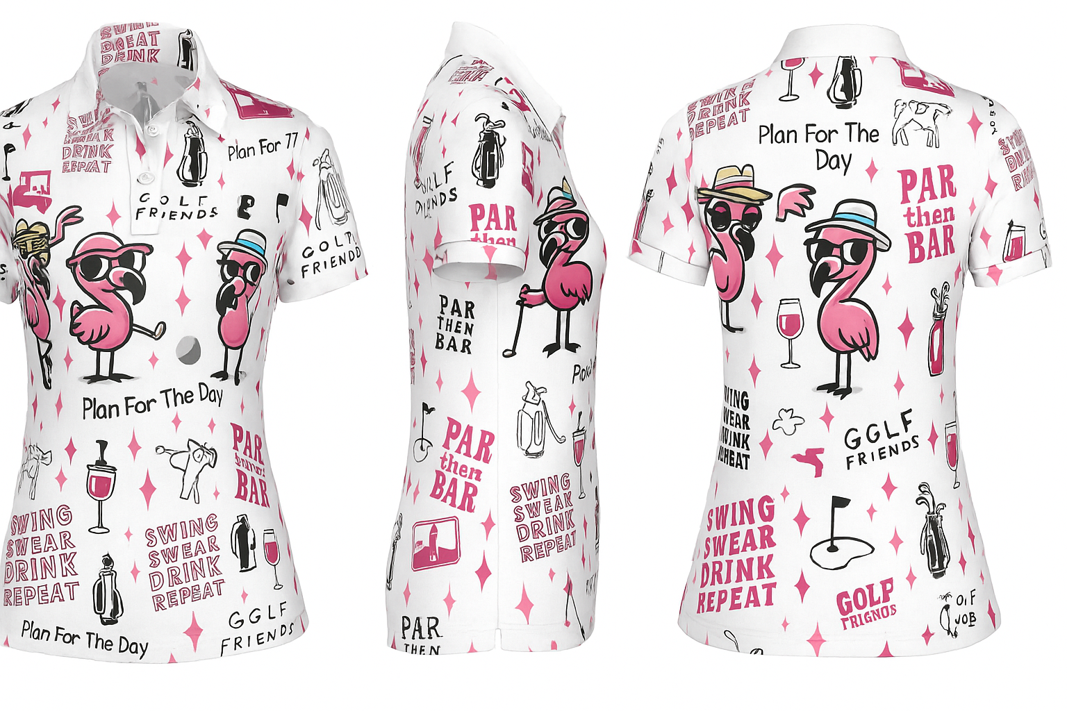 Playful Design: Bold flamingo and golf-themed graphics for a lively, carefree vibe.