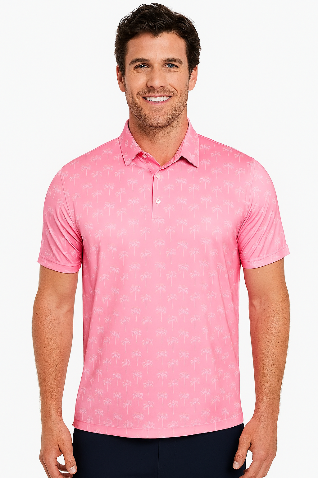 Designed for effortless charm, this pink palm-pattern performance polo combines tropical flair with modern functionality. Crafted from ultra-light stretch fabric featuring advanced moisture-wicking technology, it delivers lasting comfort and breathability. The subtle palm tree print adds a laid-back yet refined touch, perfect for sunny days on the course or relaxed weekend wear.