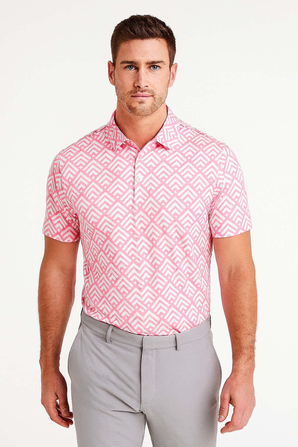 Vibrant and bold, this pink geometric performance polo combines standout design with advanced functionality. Crafted from breathable, stretch-infused fabric, it offers exceptional comfort and moisture control. The striking pattern elevates your look, blending sporty energy with refined modern style.