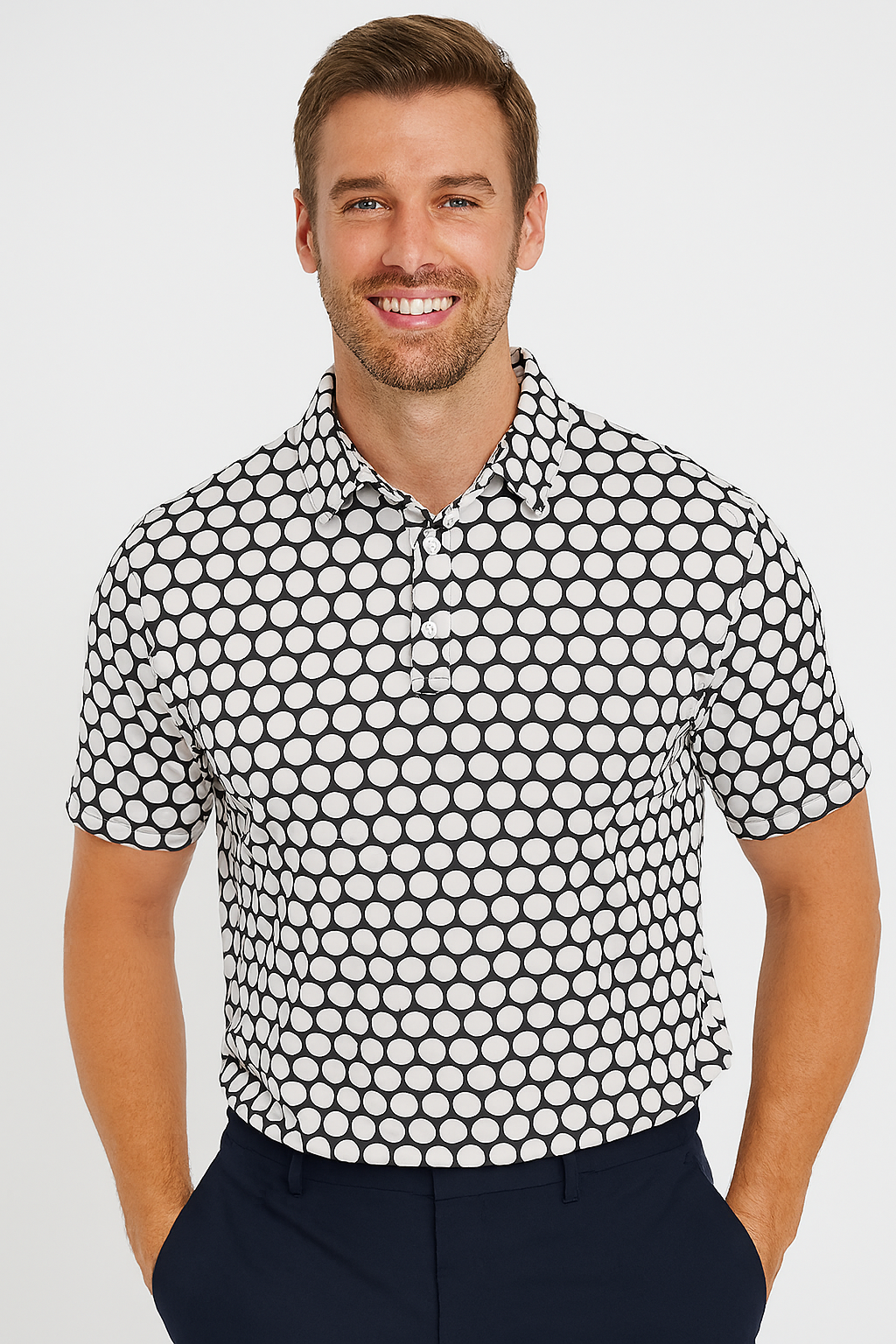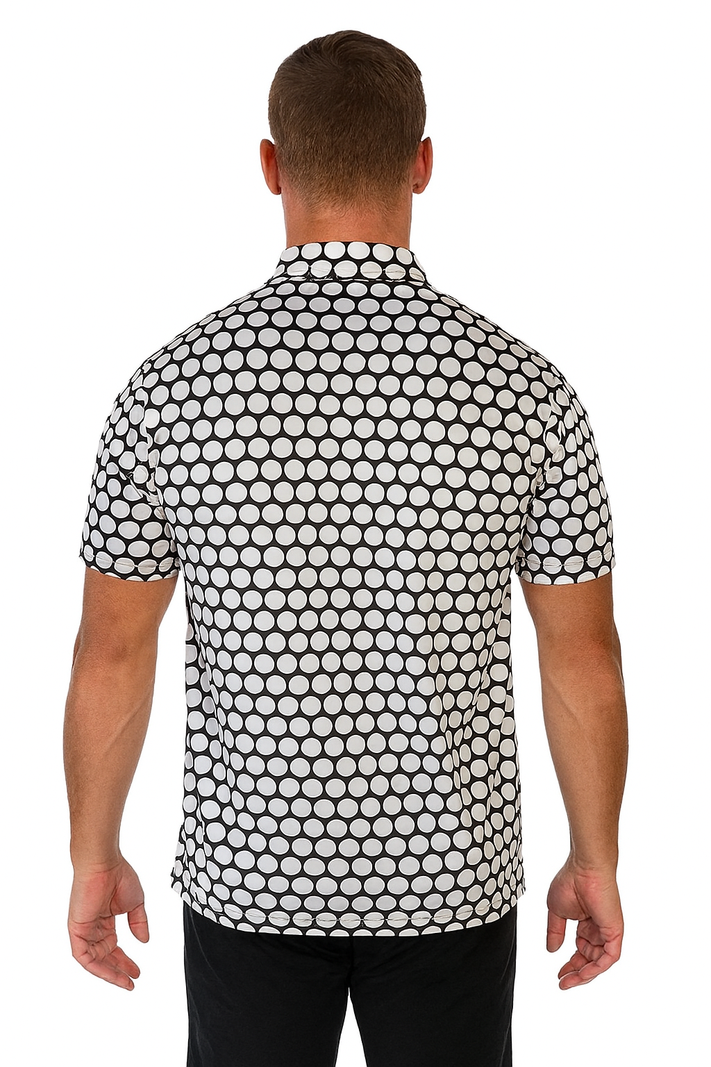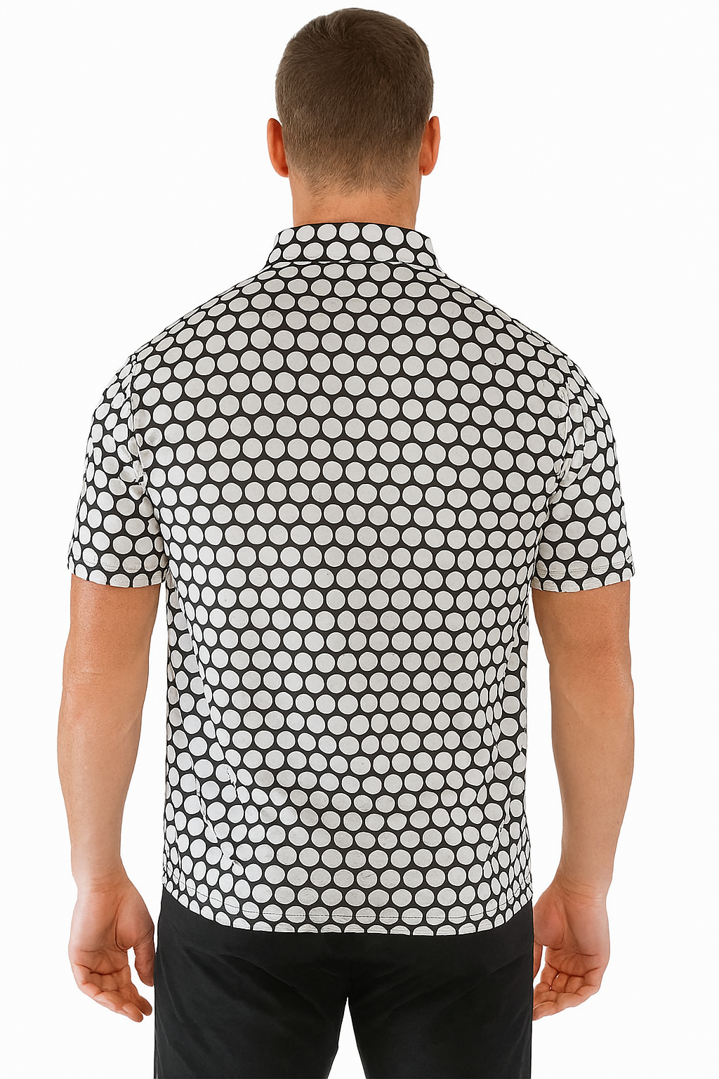 Tailored for modern minimalism, this monochrome performance polo combines bold design with technical precision. Featuring a smooth, stretch-infused fabric and advanced moisture-wicking technology, it delivers lightweight comfort and breathability. The striking polka dot pattern offers a confident, fashion-forward twist to classic athletic wear.